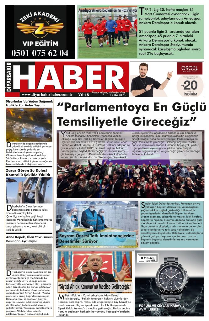 • 📌 12 Nisan Çarşamba Diyarbakır Haber Gazetesi “Parlamentoya En Güçlü Şekilde Gireceğiz” Manşetiyle okurlarıyla buluşuyor