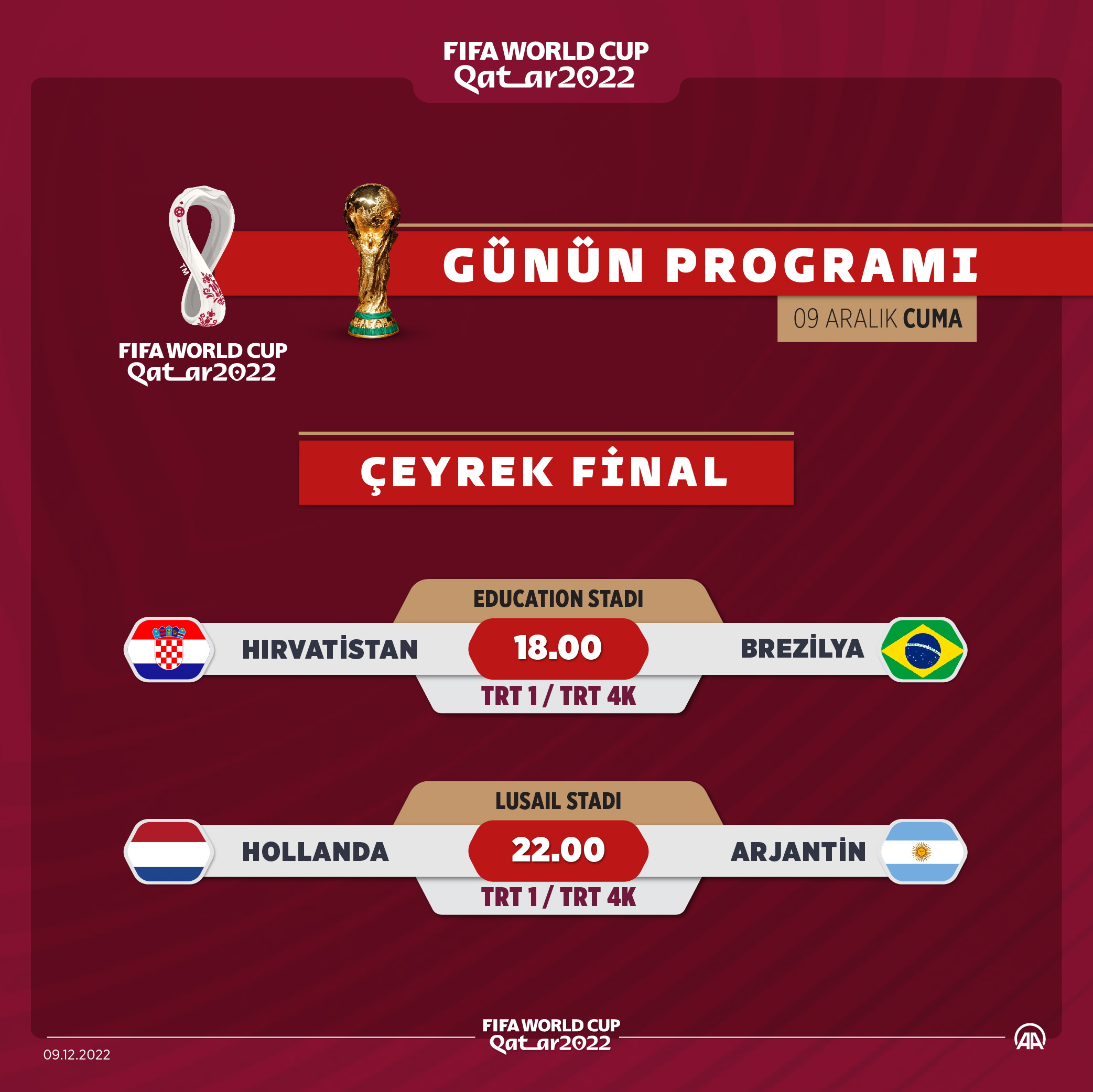 022 FIFA Dünya Kupası çeyrek final maçında Hollanda ile Arjantin, Hırvatistan ile Brezilya karşı karşıya gelecek.