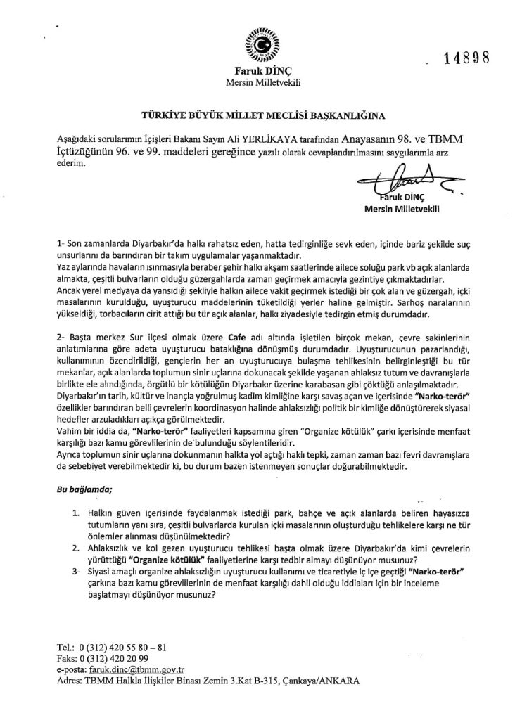HÜDA PAR Milletvekili Faruk Dinç TBMM Başkanlığına, bazı cafeleri mesken edinerek Diyarbakır halkını kuşatan uyuşturucu ticaretinin engellenmesi ile ilgili soru önergesi verdi.