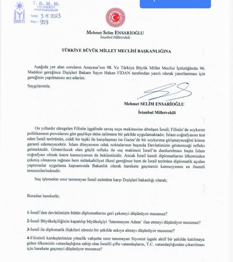 Kamuoyunda Gazze’ ye olan ilgiyi azaltma amacıyla suni gündem oluşturma gayretiyle kafatasçı bir parti başkanının gündeme getirdiği ve toplumun duyarlı kesimlerinin tepkisine neden olan, Şeyh Said Efendi ile ilgili polemik neticesinde İyi Parti’ den istifa eden İstanbul Milletvekili M. Salim Ensarioğlu, X’ teki hesabından İyi Parti Genel Başkanı Meral Akşener’ in Uşak’ ta kendisiyle ilgili ithamlarına ilişkin bir açıklama yaptı.