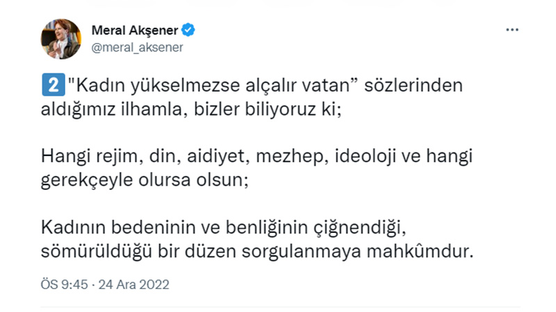 • Meral Akşener: Hangi gerekçeyle olursa olsun; kadının bedeninin sömürüldüğü bir düzen, sorgulanmaya mahkûmdur